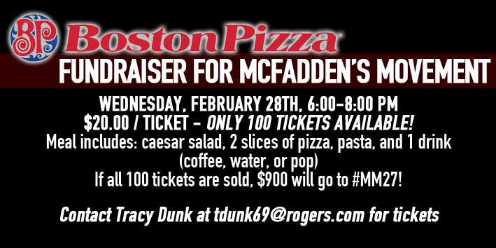 Boston Pizza (Guelph) is hosting a dinner fundraiser for McFadden’s Movement on Wednesday, February 28th.