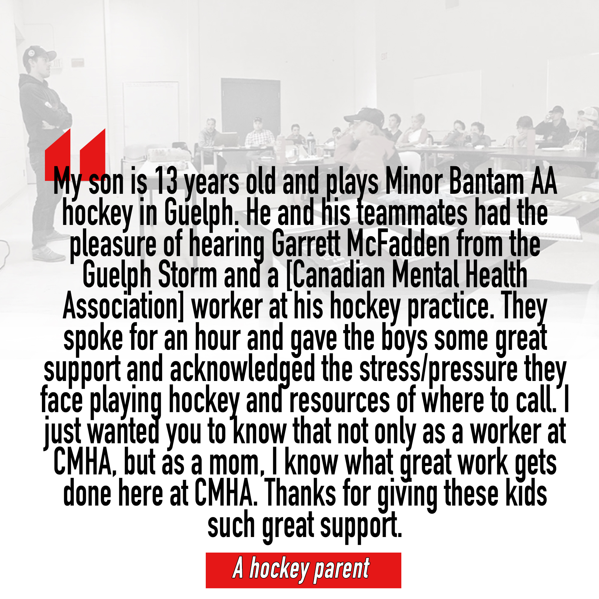 Since the start of the Movement, McFadden has been hosted by various minor hockey and sports teams, as well as schools where he has discussed his personal introduction to mental health and the obstacles he’s faced both on and off the ice. Adding to his talk, and paired with his SafeTalk training, McFadden partners with a local Canadian Mental Health Association (CMHA) professional with each presentation to ensure a safe environment for everyone involved. McFadden also welcomed over 34 MM27 Ambassadors to the Movement during the 2017-18 season.
